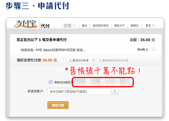 當時您在申請代付時,若於淘寶輸入的帳號跟GO購寶給您的好友帳號不同。人員則無法代付,請連繫客服幫您處理。 -