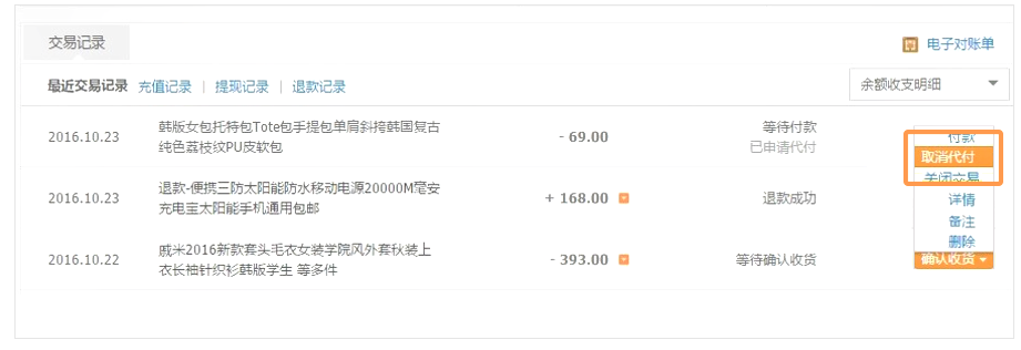 - 往下拉會看到「交易紀錄」,找到該筆金額,並點選「右方橘色/藍色下拉選單」,點選「取消代付」