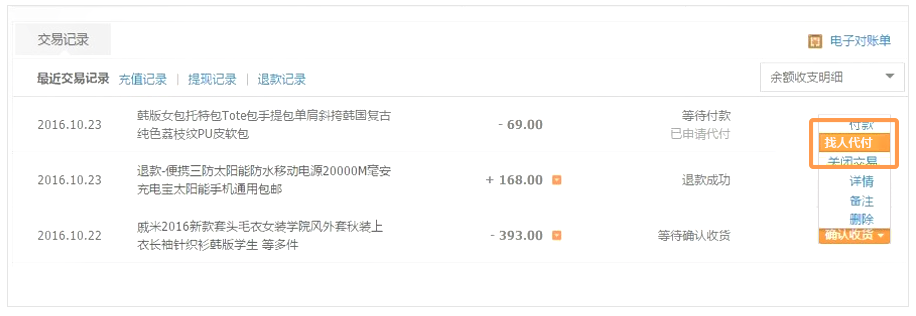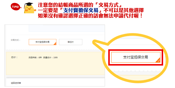 賣家改價:當您的訂單發生賣家改價的情況,只能在網頁點付款,支付寶付款頁面開啟後,選擇「支付寶擔保交易」,便可於右上角看到「找人代付」選項。
