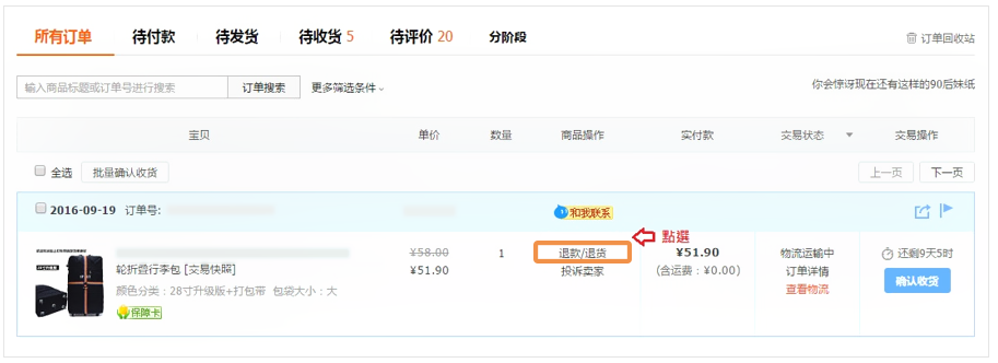 請至 我的淘寶> 已買到的寶貝> 找到欲退款商品> 退款/退貨