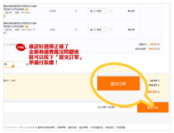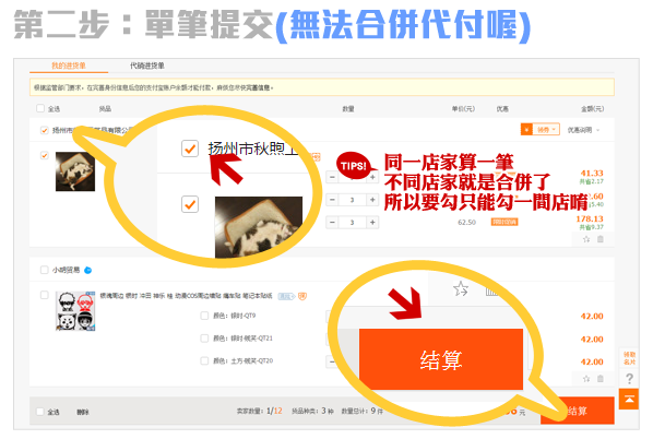 - 合併付款:阿里巴巴只支援單筆訂單申請代付喔!