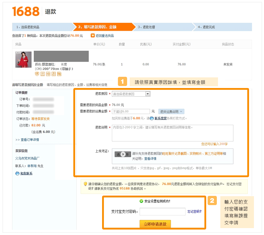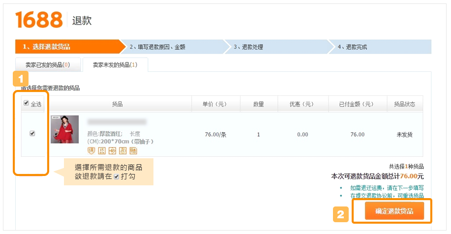 使用官方退款方式,請至阿里巴巴-我的阿里,找到該筆商品,點選退款/退貨。 -